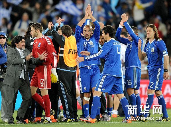 6月22日,阿根廷隊(duì)球員慶祝比賽勝利。當(dāng)日,在南非波羅瓜尼舉行的世界杯足球賽B組第三輪比賽中,阿根廷隊(duì)以2比0戰(zhàn)勝希臘隊(duì),從而以三戰(zhàn)全勝的戰(zhàn)績(jī)排名B組第一晉級(jí)16強(qiáng)。新華社記者王毓國(guó)攝