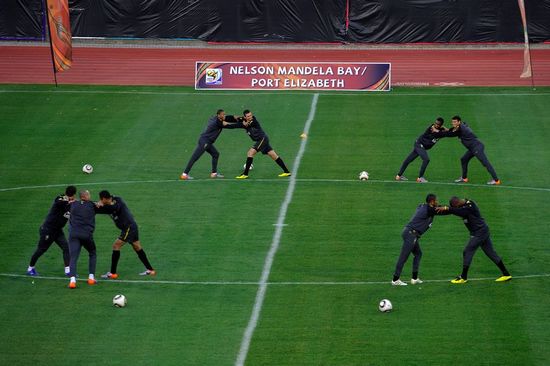 中廣網(wǎng)北京7月2日消息 2010年7月1日,南非伊麗莎白港,巴西訓練備戰(zhàn)1/4決賽與荷蘭的焦點之戰(zhàn)?ǹㄅc羅比尼奧,甚至主帥鄧加在訓練場上展示桑巴軍團細膩的腳法。圖為訓練現(xiàn)場。