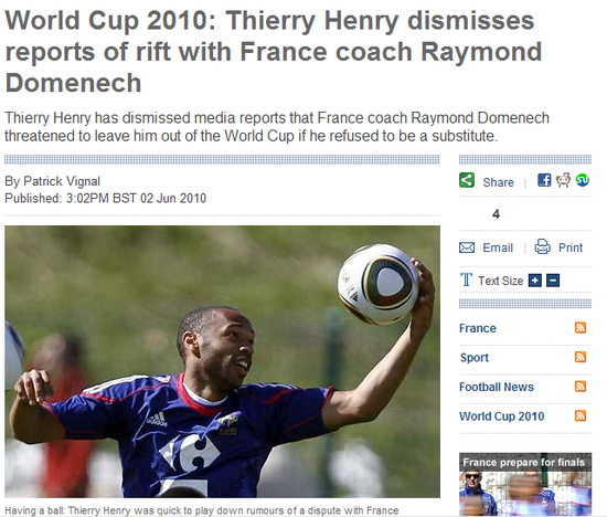 之前曾有一家地方性的媒體在報(bào)道中說(shuō)亨利不甘于在世界杯上坐冷板凳,而法國(guó)主帥多梅內(nèi)克回應(yīng)說(shuō),如果亨利不接受做替補(bǔ)的安排就不帶他去南非。對(duì)此,亨利聲明這完全是無(wú)稽之談:“我并沒(méi)見(jiàn)過(guò)這些奇怪的報(bào)道,也不知道它們是從哪冒出來(lái)的。事實(shí)上教練只跟我說(shuō)過(guò)我將不會(huì)在世界杯上首發(fā)出場(chǎng),我當(dāng)時(shí)坦然的接受了!
