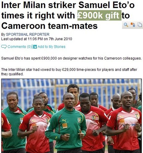 因為在對陣葡萄牙的熱身賽中吃到紅牌,所以埃托奧缺席了對陣塞爾維亞的熱身賽,缺少了埃托奧的喀麥隆最終3-4惜敗于世界杯新軍。眼看著球隊在世界杯前的熱身賽中連續(xù)輸球,埃托奧決定送給喀麥隆隊友、教練組成員以及工作人員每人一塊價值2.9磅的名貴手表,以此來鼓勵隊友一起在世界杯上打出好成績。據(jù)悉,喀麥隆代表團超過30人,埃托奧為此將花費約90萬英鎊。