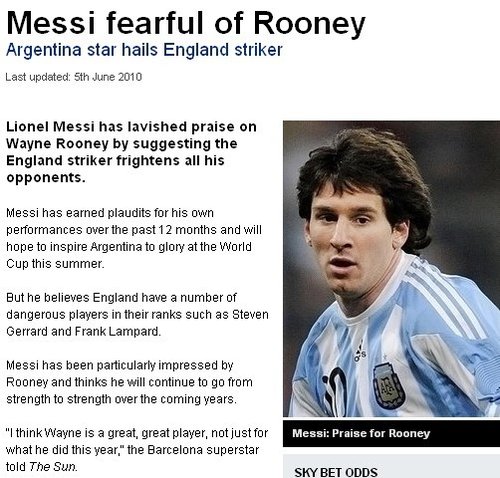 中廣網(wǎng)北京6月8日消息 如果阿根廷和英格蘭在各自的小組中獲得第一晉級,那么兩隊(duì)若想在本屆杯賽中碰面將肯定是在決賽或者季軍爭奪戰(zhàn)中。雖然這時讓阿根廷球員談?wù)撚⒏裉m的球星有些為時尚早,但在接受英國《太陽報》采訪時,梅西還是給予三獅軍團(tuán)足夠的稱贊。而在他眼中,魯尼是有資格與其競爭金球獎的超級巨星。
