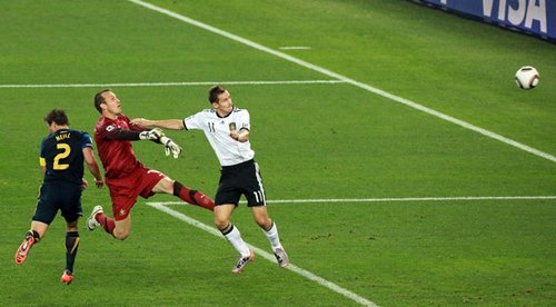 但在國家隊,克洛澤始終保持著超高的效率,09年夏季至今,9場國家隊比賽,他合計轟進5球。而今天的世界杯首戰(zhàn),他全場只有68分鐘表演,卻征服了全場球迷。進球發(fā)生在第26分鐘,當(dāng)時,拉姆右路送出精確的傳中球,后衛(wèi)正在回追打算解圍,門將正在出擊打算將球打出,就在兩者之間的狹小區(qū)域里,克洛澤高速插入,躍起頭球沖頂,硬是從門將手邊將球頂進了大門!完美的搶點意識,教科書一般的搶點破門!