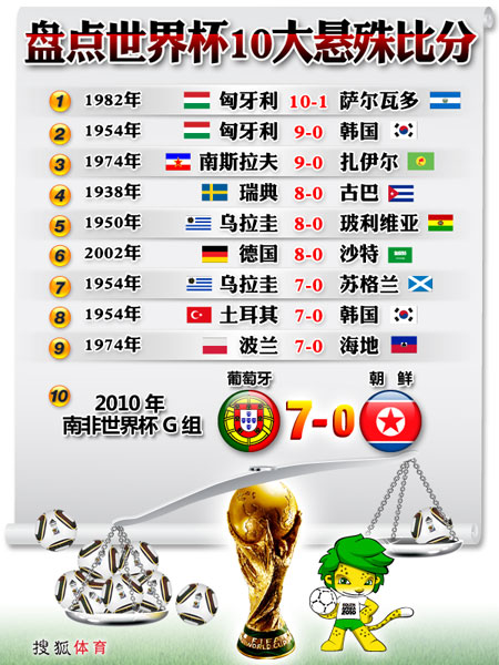 中廣網(wǎng)北京6月22日消息 北京時(shí)間6月21日,2010年南非世界杯G組將進(jìn)入第二輪爭(zhēng)奪。在開普敦綠點(diǎn)球場(chǎng),葡萄牙隊(duì)與朝鮮隊(duì)交鋒。經(jīng)過(guò)90分鐘鏖戰(zhàn),葡萄牙7-0狂勝朝鮮隊(duì),取得本屆世界杯開賽以來(lái)最大比分勝利。但這并不是世界杯上比分最懸殊的比賽,以上就是歷屆世界杯比賽分?jǐn)?shù)比較懸殊的盤點(diǎn)。