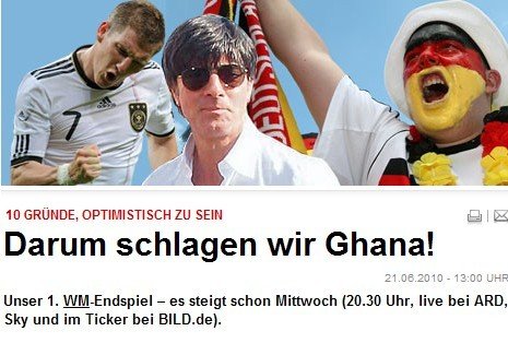中廣網(wǎng)北京6月22日消息 北京時間6月22日,距德國與加納的最后一輪生死戰(zhàn)的開始越來越近了,德國媒體《圖片報》日前總結(jié)出了10條德國擊敗加納的另類理由: