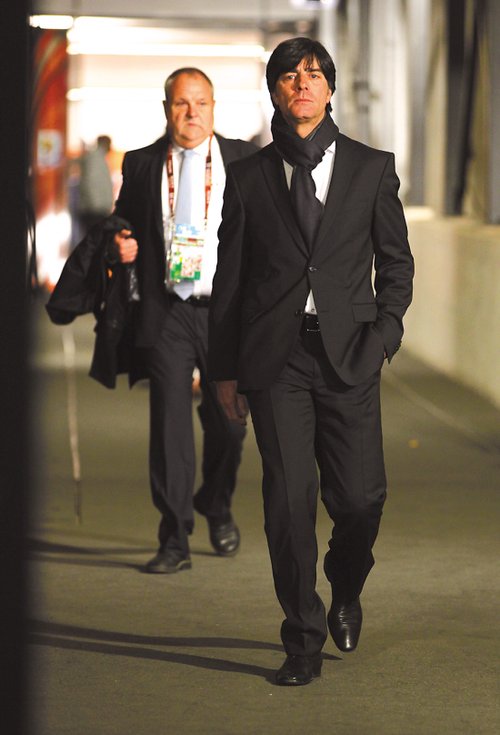 接下來,我說勒夫也很酷。2006年在克林斯曼身邊時玩的是白襯衣加西褲,今年玩的是黑西裝加圍巾,女人不服老不行,男人不洗澡不行,勒夫,不用跑也很有型。英德大戰(zhàn)中的一個小鏡頭,勒夫、比爾霍夫、弗里克三位教頭齊齊把一只腳踏在板凳上的一幕,不是一般的有型。基本上,戴副墨鏡,就可以進(jìn)攝影棚拍《無間道四》。