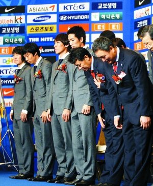 中廣網(wǎng)北京6月30日消息 29日,韓國隊完成打入16強的任務,征戰(zhàn)世界杯歸來,全民熱烈歡迎“英雄”們凱旋,并在首爾為他們舉行了慶功晚會。韓國隊當天舉行了解散儀式,球員們在解散儀式上鞠躬致謝。韓國足協(xié)將在下個月正式選出國家隊新任主教練,韓國足協(xié)官員表示,許丁茂(右)或許會連任。