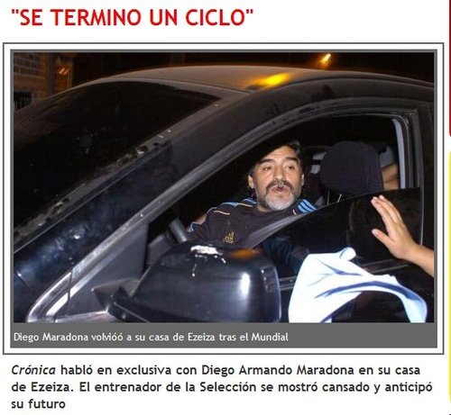 中廣網(wǎng)北京7月6日消息 北京時間7月6日凌晨來自阿根廷的消息,馬拉多納在布宜諾斯艾力斯的紀(jì)實電視臺專訪中透露,他將主動辭去阿根廷國家隊主教練一職,“我的使命已經(jīng)結(jié)束”。據(jù)悉馬拉多納還沒有正式遞交辭呈,他首先要和家人一起度假,阿根廷足協(xié)也沒有就此事表態(tài)。