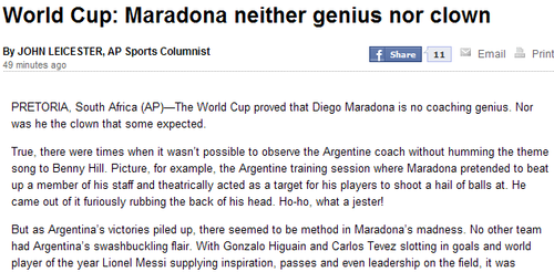 中廣網(wǎng)北京7月6日消息 北京時間7月5日,來自雅虎體育的消息,馬拉多納并非一個執(zhí)教天才但他卻像一個球場邊的小丑。