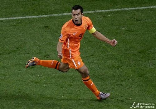 為荷蘭隊(duì)打開(kāi)勝利之門的不是小飛俠羅本,也不是此前表現(xiàn)出色的斯內(nèi)德,而是老隊(duì)長(zhǎng)范布隆克霍斯特。這位年已35歲、為橙衣軍團(tuán)出戰(zhàn)超過(guò)100場(chǎng)的老將在第18分鐘用一腳精彩的遠(yuǎn)射敲開(kāi)了烏拉圭門神穆斯萊拉的十指關(guān),也敲開(kāi)了荷蘭隊(duì)的決賽之門。