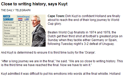 庫(kù)伊特今年29歲,在同烏拉圭的比賽上他扮演了重要的角色,保持著25場(chǎng)不敗記錄的荷蘭隊(duì)是否可以讓他們?cè)谧詈笠粓?chǎng)決賽上也能脫穎而出。在決賽前夕,庫(kù)伊特說(shuō):“我收到了很多球迷發(fā)來(lái)的短信和郵件,雖然我不知道在決賽時(shí)我們能有什么樣的表現(xiàn),但是看他們的短信,我覺(jué)得全世界的人都在支持我們!