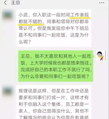 山西省運(yùn)城市的小武剛參加工作一年多,她的工作都完成得不錯(cuò),卻在近日收到了領(lǐng)導(dǎo)的談話。領(lǐng)導(dǎo)稱:小武的工作表現(xiàn)挺不錯(cuò),但是發(fā)現(xiàn)她和同事們好像不太合群,總是不和同事們一起吃飯。對(duì)此,小武感到十分困惑和委屈,她認(rèn)為在公司做好自己的本職工作就好了。