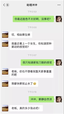 前倆天,岳云鵬在微博上曬出和助理沖沖的聊天記錄,并配文:“下午跟沖沖掏了薪窩子!敝硐胍獫q工資,說(shuō)自己“薪事重重、薪如止水”,而岳云鵬則回復(fù)說(shuō)“薪靜自然涼”。