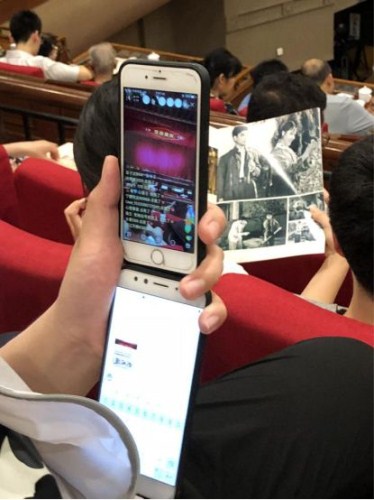 現(xiàn)場有鄭州大學的學生戲迷在網(wǎng)絡視頻直播演出前的現(xiàn)場和謝幕盛況