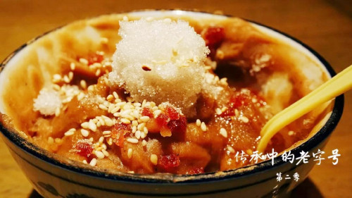 有一年,到北京來上供的外地大臣,給御膳房帶了一種金黃色類似小米的糜子米。當(dāng)時宮廷里頭還沒見過這種米,我曾祖父李金祥,就把這個米先用水泡了,然后晾干,用手工磨成面粉。用開水一沖,顏色馬上就變成金黃色,這個面馬上就凝固了,然后他就給配上點紅糖,擱了點桂花汁、核桃仁、芝麻仁,在皇宮里頭,他們感覺是相當(dāng)好。就把這茶湯定為了宮廷早茶,這應(yīng)該說就是茶湯的由來。