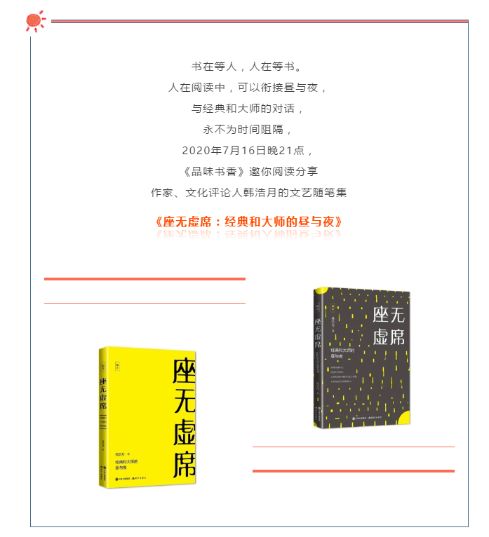 聽眾朋友大家好,我是韓浩月!蹲鶡o虛席》是一本我新出版的文藝評論隨筆集,它一共分為四輯,“告別信”是分別是寫給近年去世文化名人的悼念文章,“心靈史”是重讀世界名著以及談這些名著對我的個人影響,“光影夢”寫了二十部這幾年公映的有可能成為經(jīng)典的新電影,“注目禮”記錄了我所了解的一些作家、導(dǎo)演、演員們的創(chuàng)作與生活。 這首先是一本基于個人審美與閱讀趣味的書,書里寫到的每一個人、每一本文學(xué)經(jīng)典、每一部優(yōu)質(zhì)電影,都不同程度地給我?guī)磉^影響和沖擊,可以這么認(rèn)為:這本書的內(nèi)容,塑造了我現(xiàn)在的樣子,或者換個說法:現(xiàn)在的我,心里駐扎著這些人、這些書、這些電影,他們告訴我怎么去思考,給了我看待世界的一個視角,同時也告訴我怎么去生活,用他們曾經(jīng)使用過的辦法,去擁抱生活中發(fā)生的一切。