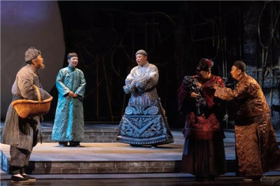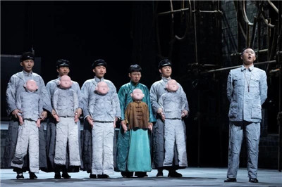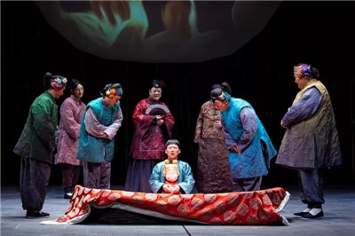 在此次創(chuàng)作中,方旭力邀王琛、胡天驥、劉釗、阿寬、周飛、胡水、李予多等各領(lǐng)域的藝術(shù)家加盟,在舞美、服裝、音樂、偶等層面進行了大膽的嘗試。舞臺上八塊坡度平臺,不時開合,靈動多變的創(chuàng)造出牛宅、街市、學(xué)校等等空間,讓觀眾感受到充滿想象力的舞臺空間。周飛、周琦的現(xiàn)場伴奏,更是給演出一抹全新的亮色,充滿現(xiàn)代氣質(zhì)的音樂混搭上傳統(tǒng)的鑼鼓經(jīng),把《牛天賜》中角色的內(nèi)心展現(xiàn)得淋漓盡致。此次以現(xiàn)代審美角度營造全新的老舍戲劇印象,打造出一部既充滿極簡美學(xué),又具有豐富想象力和趣味性的當代話劇作品,也是方旭導(dǎo)演“大寫意”戲劇風(fēng)格的一貫追求。