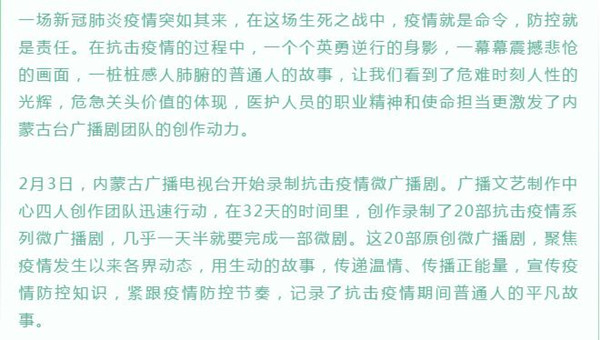 內(nèi)蒙古20部微廣播劇:“藝”聲戰(zhàn)疫,聲聲傳情