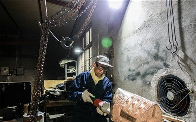 編鐘調(diào)音是通過打磨編鐘內(nèi)壁的形狀、薄厚來實現(xiàn)的。調(diào)音時,巨大的編鐘由工業(yè)吊爪吊起落下,放置在沾滿灰塵的工作臺上。炎炎夏日,依然要穿著長袖長褲的工作服,戴好帽子、手套、護(hù)目鏡、口罩,塞上耳塞,把自己捂得嚴(yán)嚴(yán)實實……打磨用的砂輪被捆綁在一根長木棍上,伸向編鐘的內(nèi)壁,機器一開,噪音刺耳、銅粉飛揚,而此時,手持砂輪的劉佑年,雙目緊盯鐘內(nèi),不敢絲毫走神……打磨幾秒還是幾分鐘、打磨的位置在哪,完全靠經(jīng)驗,這是一個“不可逆”的過程,稍有不慎就“滿盤皆輸”。幾秒鐘后,劉佑年關(guān)閉機器,拍拍身上的粉塵,取出耳塞。再拿起巨大的鐘錘,擊打編鐘,“當(dāng)——”渾厚的鐘聲響起,劉佑年閉眼聆聽,音準(zhǔn)、音色、延時長度如何,哪里還需打磨,在他心中有了分寸。然后,他再次塞上耳塞,開啟砂輪……