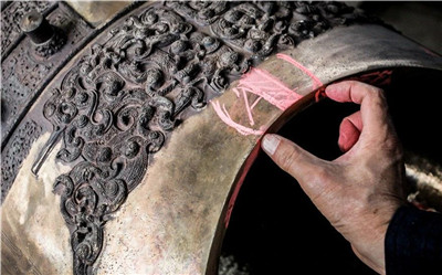 看起來樸厚沉重的編鐘體,其實是一個制作上精妙的共鳴腔。腔體上的各個部位與樂音有著千絲萬縷的聯(lián)系,音準(zhǔn)、音色、余音的延時長度等多項音指標(biāo)錯綜交織,共存于編鐘內(nèi)壁中鑄造一口編鐘,要經(jīng)過22道工序:蠟?zāi)!⒅品、脫蠟、焙燒、澆筑、清砂……每道工序,都必須手工打造,溫度、濕度、精度,都要精?zhǔn)控制。最艱難的一步,是最后的調(diào)音。作為舞臺演出樂器,編鐘對音準(zhǔn)的要求極高。一套編鐘,如果音調(diào)不準(zhǔn)或音色不美,外壁再雕龍繪鳳、紋飾華麗,也是“廢品”。