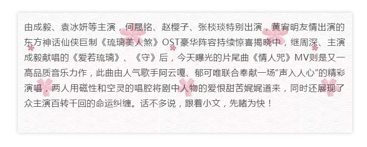 MV以時(shí)間順序?qū)⒊跤龇驄D前世今生的愛(ài)恨情仇示于觀(guān)眾面前,開(kāi)篇音律空靈奠定該劇浪漫唯美的氛圍,隨之便釋放虐心信號(hào),璇璣(袁冰妍飾)輕蔑道:“我平生就沒(méi)見(jiàn)過(guò)真心這個(gè)東西,我也不相信這個(gè)世上有什么真心” 讓人疑慮,司鳳(成毅飾)則深情款款:“你說(shuō)你不相信真心,這一次,我為我自己賭一次,我賭你會(huì)不會(huì)把我記在心里”二人亦虐亦蘇的內(nèi)心獨(dú)白讓網(wǎng)友直呼“初遇cp鎖死”“琉璃臺(tái)詞鯊我!”隨著歌曲逐漸進(jìn)入高潮,初遇夫婦命運(yùn)玄機(jī)也愈發(fā)復(fù)雜,嘬手指、頻繁擁抱、喂藥吻等發(fā)糖畫(huà)面甜入心底,點(diǎn)九世淚痣、痛哭絕望、吐血等情感爆發(fā)的場(chǎng)面也讓人揪心,司鳳、璇璣、昊辰(劉學(xué)義飾)、玲瓏(張予曦飾)、敏言(李俊逸飾)、紫狐(侯夢(mèng)瑤飾)、無(wú)支祁(傅方俊飾)、小銀花(楊肸子飾)等人的情愫都在阿云嘎和郁可唯飽含深情的演繹中悉數(shù)呈現(xiàn),讓觀(guān)眾感同身受。