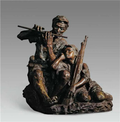 這件作品不到一米高,刻畫(huà)了一個(gè)老紅軍戰(zhàn)士吹笛子,小戰(zhàn)士依偎在一旁聽(tīng)其演奏。據(jù)作者本人介紹,它是1928年海南島瓊崖縱隊(duì)的戰(zhàn)士們艱苦環(huán)境的寫(xiě)照。很多人在中學(xué)課本中也曾看過(guò)它。它沒(méi)有描摹激烈的戰(zhàn)爭(zhēng)場(chǎng)景、高大英勇的戰(zhàn)士形象。而是通過(guò)革命間歇,帶有浪漫抒情的人物刻畫(huà),表達(dá)了革命樂(lè)觀主義情緒和詩(shī)意的革命浪漫主義情懷。