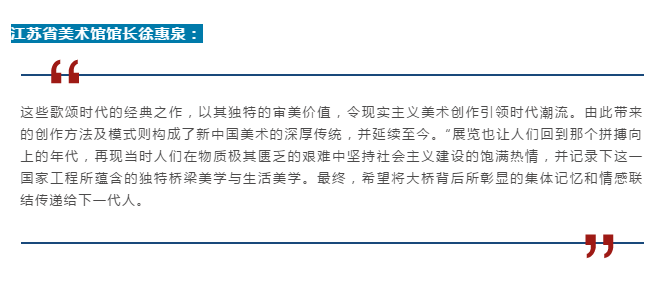 主題性經(jīng)典典藏大家名作、時(shí)代情景復(fù)原,有生氣,接地氣,“‘大橋記憶’顯然是對(duì)主旋律美術(shù)策展的一次有益探索和嘗試。“這類(lèi)展覽要避免教科書(shū)式的說(shuō)教,自覺(jué)走近群眾,用生活化細(xì)節(jié)打動(dòng)人,用接地氣的故事抒發(fā)情懷,力爭(zhēng)作品真實(shí)、好看、動(dòng)情,引發(fā)與觀眾的共鳴。”