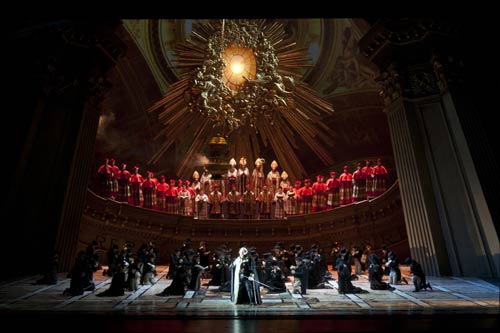 新古典主義的舞臺設(shè)計讓新版《托斯卡》從一開始就美得“超凡脫俗”,美得典雅、磅礴、精致又大氣,同時不乏現(xiàn)代與時尚。特別值得一提的,巨大雄偉的建筑結(jié)構(gòu)呈傾斜呈現(xiàn),好似鏡頭過濾后扭曲的畫面。每一幕中,也隨處可見閃耀著強卡洛天才般智慧的處理。第一幕結(jié)尾處,教堂的穹頂徐徐打開,不斷擴大的縫隙像是慢慢睜開的“雙眼”,教堂四壁的油畫竟然出現(xiàn)在了穹頂,電影鏡頭式的視角轉(zhuǎn)換創(chuàng)造了奇異的舞臺效果。而當?shù)谝荒唤K場的宗教場面進入高潮時,觀眾原以為畫面將就此“定格”,未曾想一座冒著裊裊炊煙的香爐又從舞臺側(cè)面橫空而出,鐘擺似的回蕩搖擺,預示著劇中人物跌宕起伏的命運。