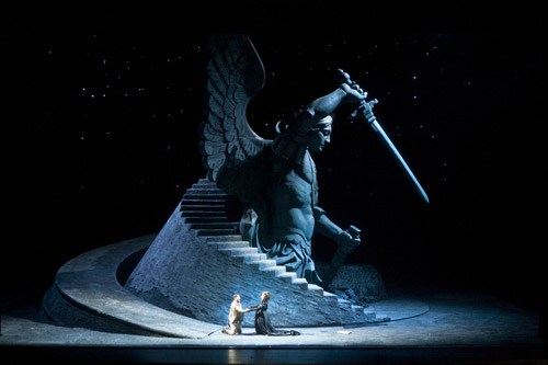 其后,舞臺進入了全劇的高潮,第二幕和第三幕之間出現(xiàn)了一次完全沒有幕間休息的換景。傾斜的宮殿伴隨著斯卡皮亞的死亡沉入地下,同時一座手持長劍、雙翅展開的巨型天使像呈現(xiàn)在舞臺后方,如電影鏡頭般的徐徐從舞臺后方向前推進。雖然演員還未開口演唱,為完成這一場景轉(zhuǎn)換,國家大劇院舞臺技術(shù)部門也面臨著比以往更多考驗。巨大的天使高度近8米,利用的舞臺縱深也多達近50米。盡管每天國家大劇院每天都有一流的演出,但這種獨特的舞美結(jié)構(gòu)和無縫銜接的轉(zhuǎn)換方式還是頭一次。