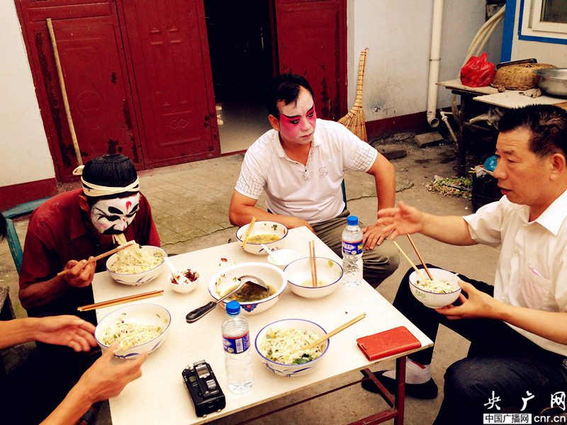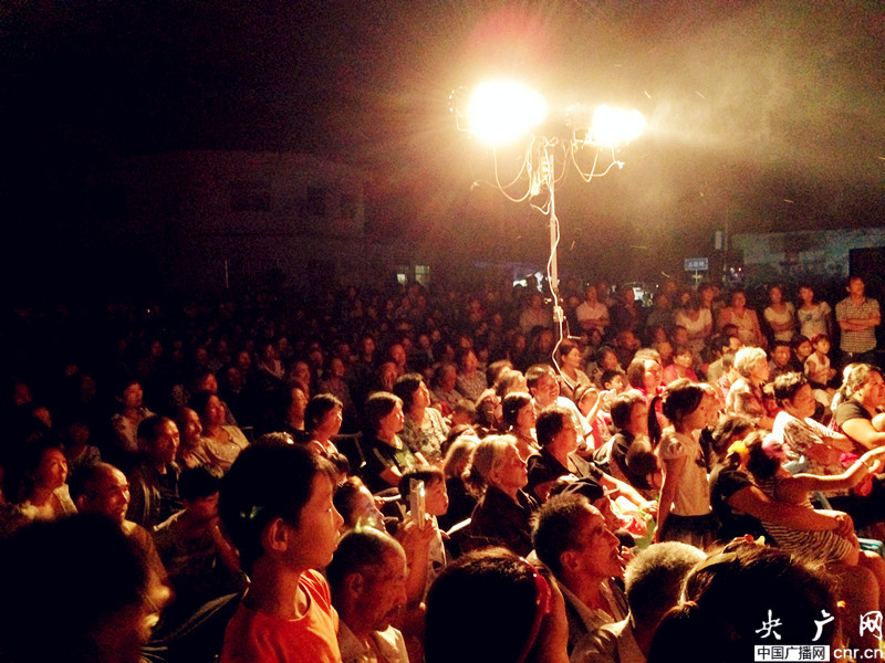 當(dāng)晚活動(dòng)從8點(diǎn)開(kāi)始,一直持續(xù)到夜間12點(diǎn),村民們從家里搬出小木椅,找不到椅子的,開(kāi)來(lái)電動(dòng)三輪車,把由鋼管、木板、彩條布組裝起來(lái)的簡(jiǎn)易舞臺(tái),圍得水泄不通。節(jié)目很豐富,有小品、豫劇、肚皮舞、廣場(chǎng)舞等,由于正值小暑,不少唱戲演員臉上的油彩,浸了汗水開(kāi)始融化。王行軍隨即找來(lái)一臺(tái)立式風(fēng)扇,放到不足兩米寬、僅憑一只10W燈泡照明的后臺(tái)中間,演員們依次走上前吹風(fēng),王問(wèn):“中不中?”,大伙笑著說(shuō):“中!”