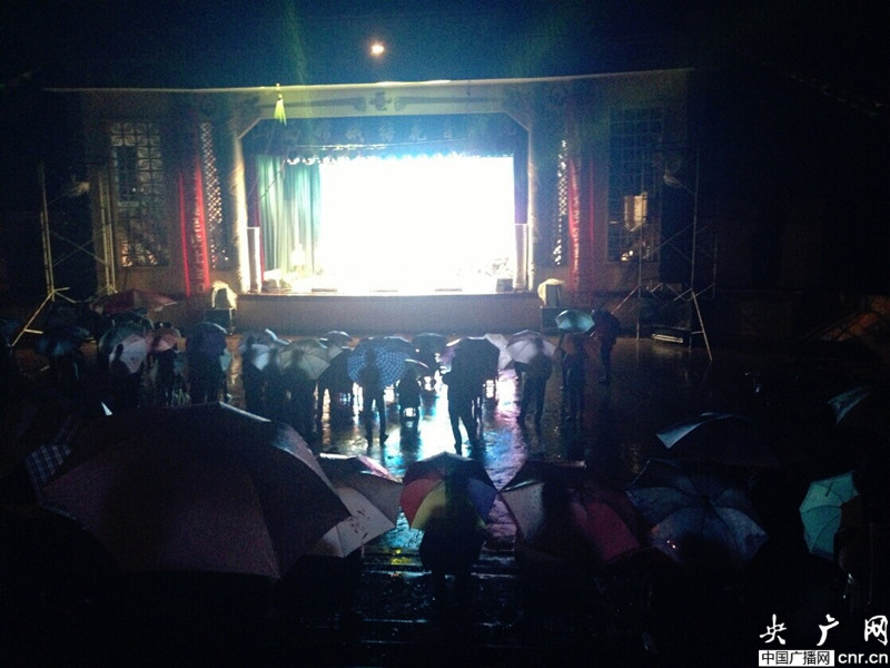 撐著雨傘看戲的鄉(xiāng)親們