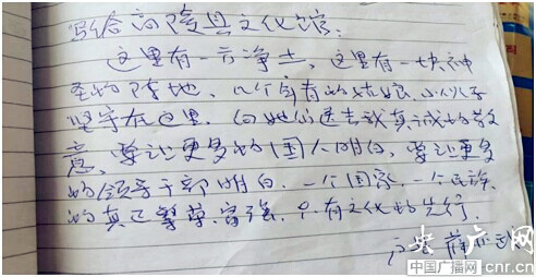 最后,我想引用高陵縣文化館大廳里,進門第一張桌子上的《文化服務(wù)“110”意見手冊》里的一條留言來結(jié)束這次的采訪:這里有一方凈土,這里有一塊神圣的陣地,幾個年青的姑娘、小伙子堅守在這里。向她們送去我真誠的敬意,要讓更多的國人明白,要讓更多的領(lǐng)導(dǎo)干部明白,一個國家、一個民族的真正繁榮富強,只有文化先行。