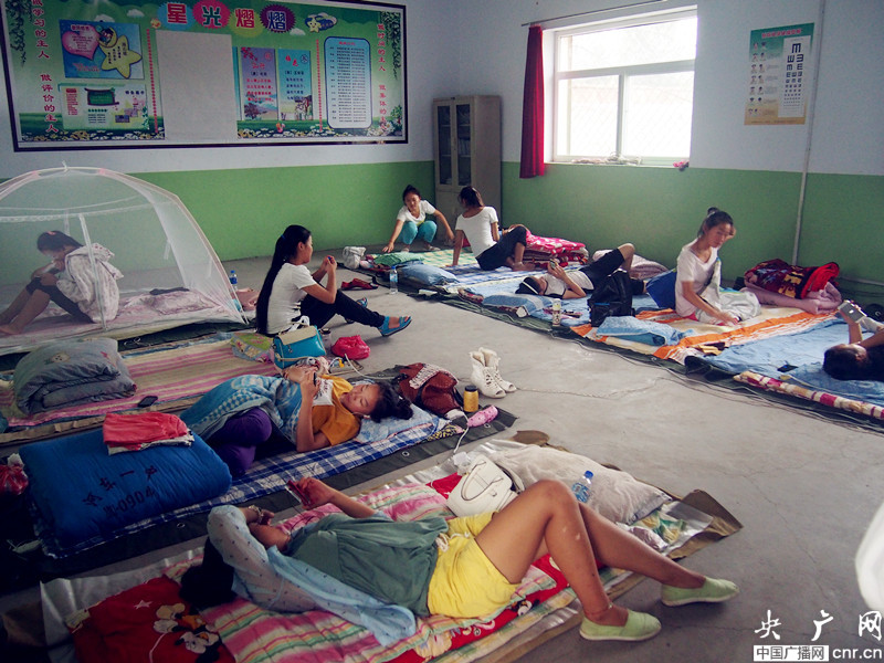 演出開始前演員們在學校教室里的臨時宿舍休息