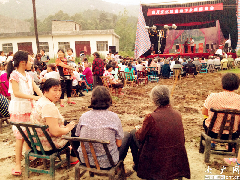 當(dāng)晚活動(dòng)從8點(diǎn)開始,一直持續(xù)到夜間12點(diǎn),村民們從家里搬出小木椅,找不到椅子的,開來(lái)電動(dòng)三輪車,把由鋼管、木板、彩條布組裝起來(lái)的簡(jiǎn)易舞臺(tái),圍得水泄不通。節(jié)目很豐富,有小品、豫劇、肚皮舞、廣場(chǎng)舞等,由于正值小暑,不少唱戲演員臉上的油彩,浸了汗水開始融化。王行軍隨即找來(lái)一臺(tái)立式風(fēng)扇,放到不足兩米寬、僅憑一只10W燈泡照明的后臺(tái)中間,演員們依次走上前吹風(fēng),王問(wèn):“中不中?”,大伙笑著說(shuō):“中!”