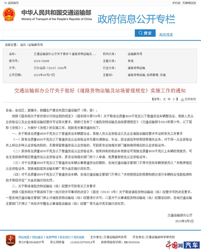 中國(guó)網(wǎng)汽車9月24日訊 根據(jù)我網(wǎng)記者獲悉,近日,交通運(yùn)輸部辦公廳發(fā)布了《關(guān)于做好道路貨物運(yùn)輸及站場(chǎng)管理規(guī)定實(shí)施工作》的通知,明確了取消“雙證”以及企業(yè)道路運(yùn)輸經(jīng)營(yíng)許可證、取消道路貨物運(yùn)輸站(場(chǎng))經(jīng)營(yíng)許可的有關(guān)工作要求。
