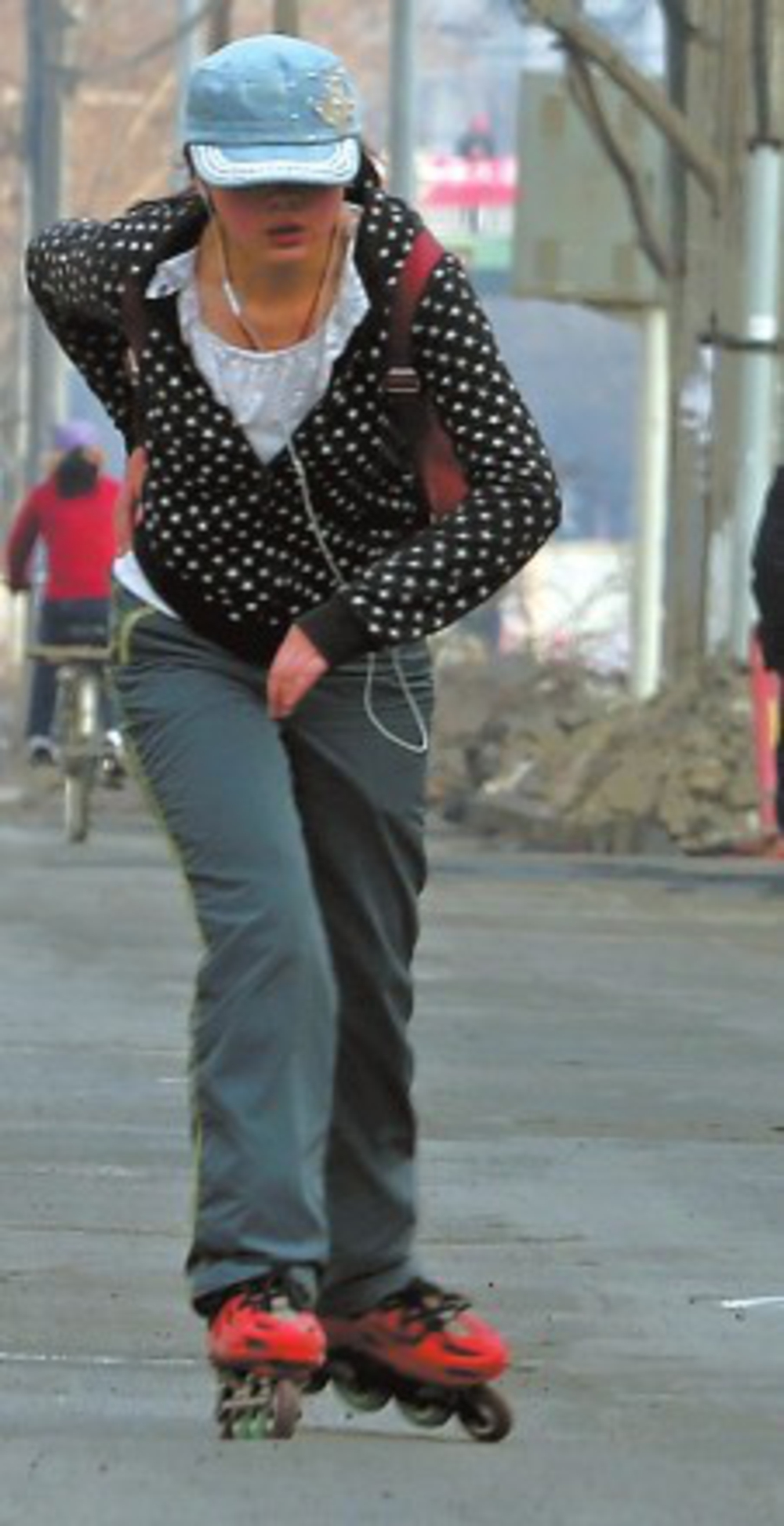 7日8時(shí)48分,在阿勒泰路,一位市民滑輪滑出行。