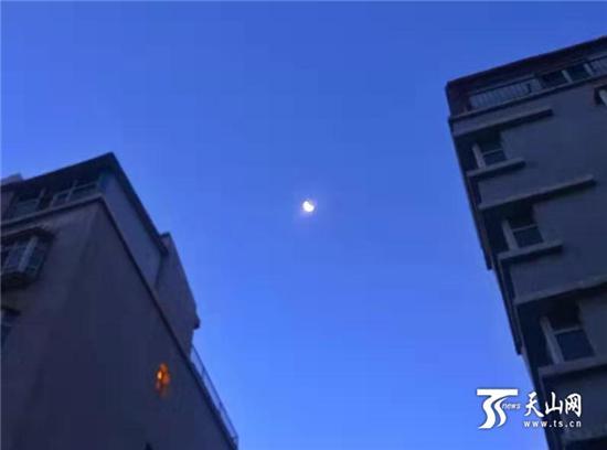 10月23日早晨,一輪明月高掛天空,烏魯木齊天氣晴朗。記者張萬德 攝