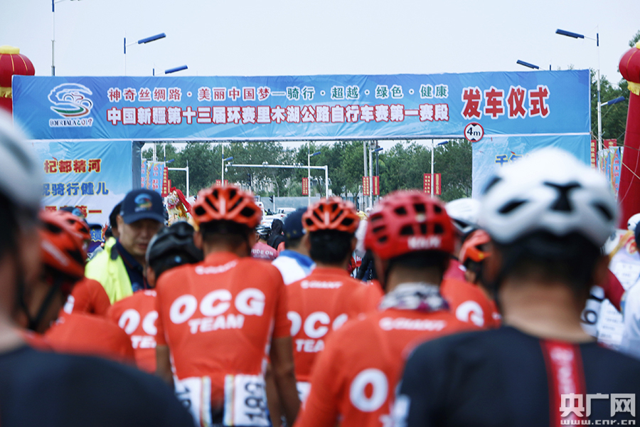 參加環(huán)賽里木湖公路自行車賽的車手等待比賽開始(央廣網(wǎng)見習(xí)記者 王天浩 攝)