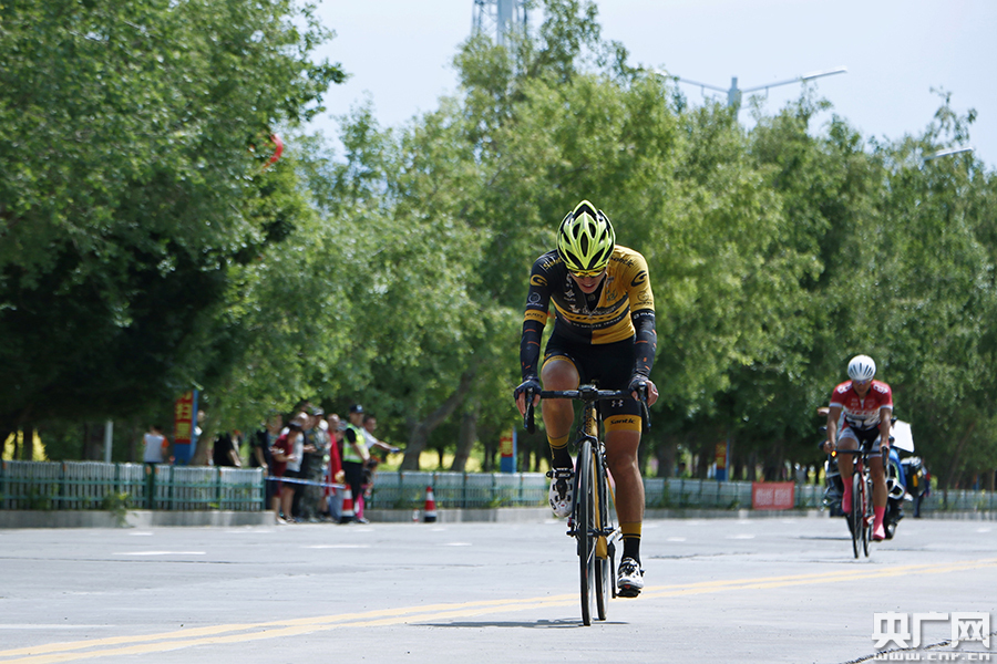 到雙河市時,炎熱的天氣使比賽更為艱苦,大部分選手準(zhǔn)備的補給水已喝完,選手出現(xiàn)抽筋、體力不支等狀況。經(jīng)激烈角逐,來自上海邁金朝盟體育車隊選手劉祝慶力克強敵,以 2小時39分 58秒的騎行時間率先沖過終點線,奪得第一賽段冠軍,并以沖刺第一名成績將黃衫、綠衫攬于一身。