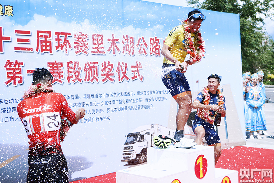 贏得環(huán)賽里木湖公路自行車賽第一賽段前三名的車手開香檳慶祝(央廣網(wǎng)見習(xí)記者 王天浩 攝)