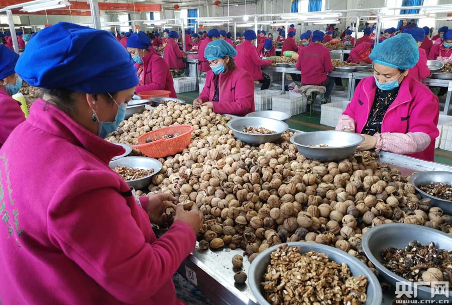 和田縣布扎克鄉(xiāng)引進6家企業(yè)解決當?shù)卮迕窬偷鼐徒蜆I(yè),村民們團結協(xié)作共同發(fā)展。央廣網(wǎng)記者吳卓勝 攝