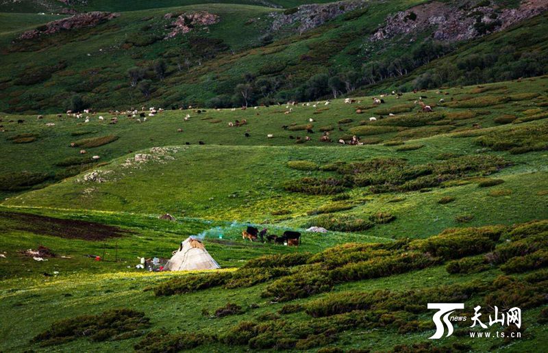 據悉,孟布拉克是平均海拔2300多米的高山草原。每到夏季云霧常在山間游走,令人感受到“手摸白云天,腳踏綠草地”的悠然之情,被稱為“云頂草原”。攝影愛好者孫明清說:“我最愛這里的山花,紅的、黃的、紫的、白的,不同的區(qū)域分布著不同顏色的花,聽說每種花花期不同,在山間次第開放,讓整個夏季都保持著美麗的顏色!