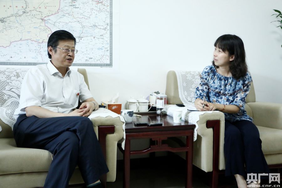 央廣記者蔣雪嬌正在采訪新疆社科院院長丁守慶