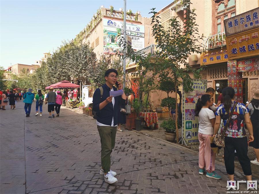 見習(xí)記者王天浩正在喀什古城連線中國之聲