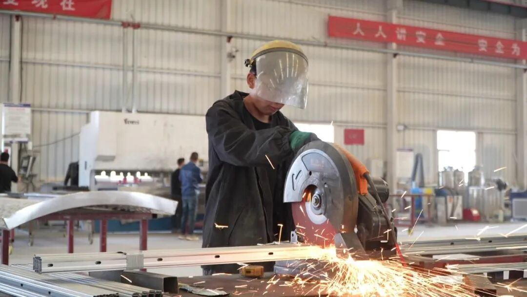 車間內(nèi),工人們正熟練地操作設(shè)備切割型材 (張勇 攝)