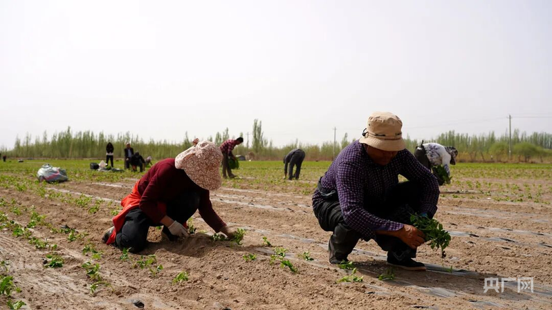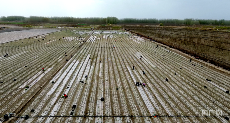 務(wù)工人員有序開(kāi)展覆膜、打孔、運(yùn)苗、栽苗、覆土等一系列工序 (央廣網(wǎng)發(fā) 阿依努爾 攝)
