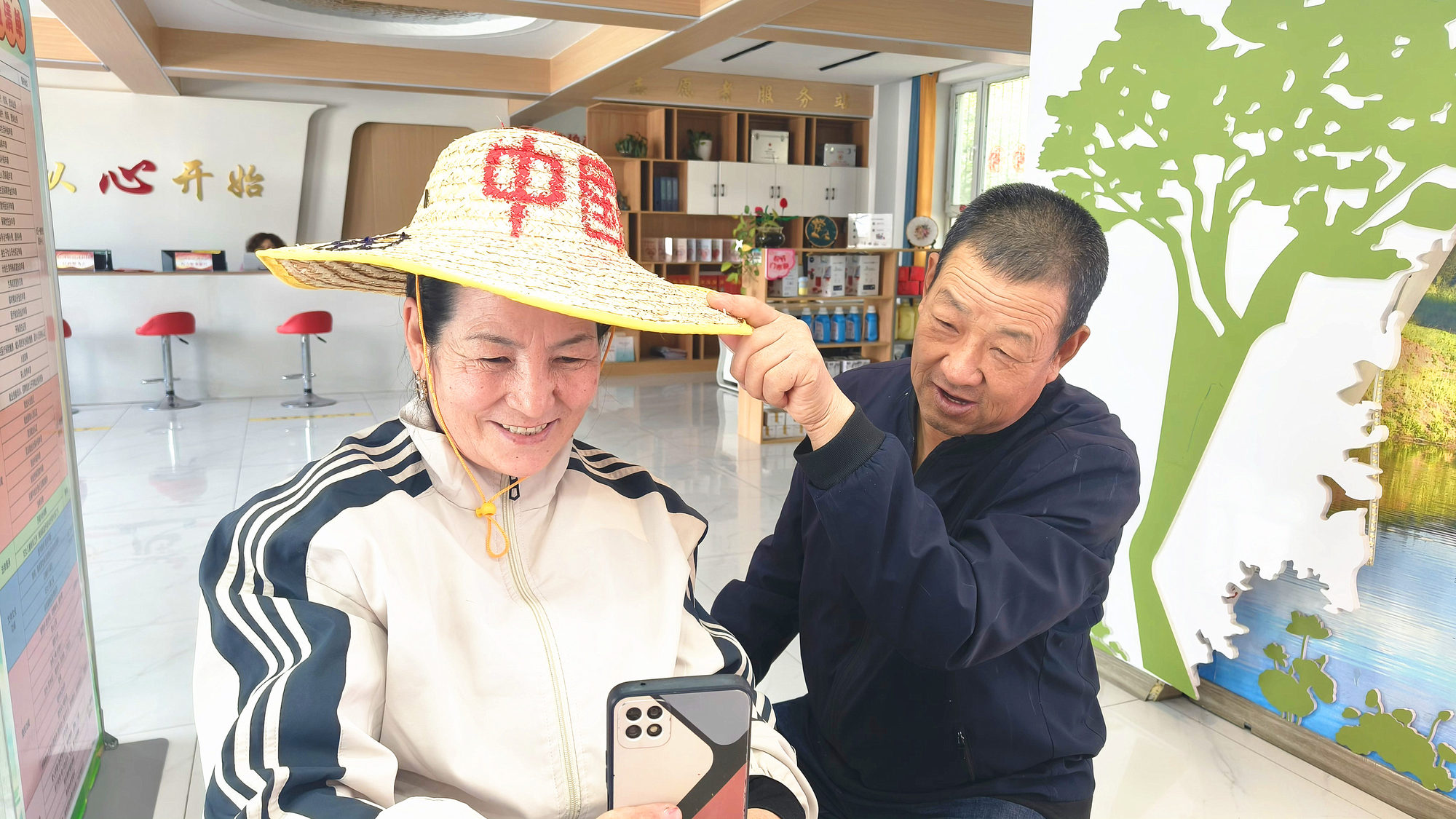 居民戴著自己繪制的草帽,拍照留念 (李靖 攝)