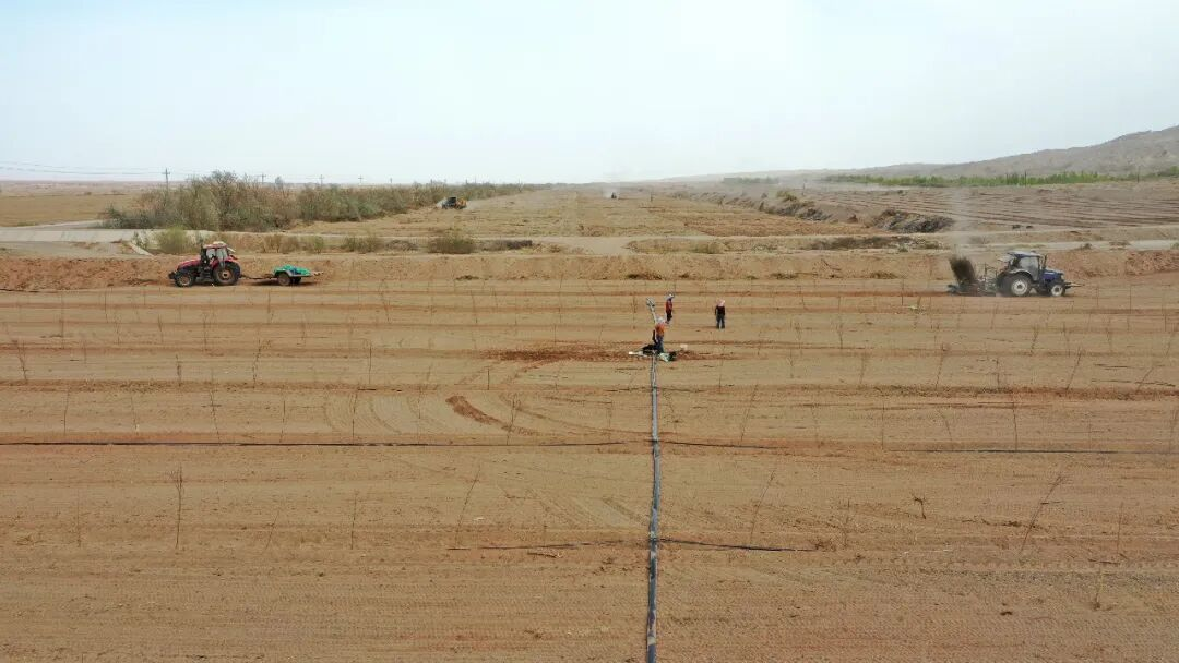 4月20日,示范園現(xiàn)場(chǎng)機(jī)械轟鳴、人聲鼎沸,一派繁忙景象。挖掘機(jī)平整土地,自動(dòng)化植樹機(jī)連貫完成開溝、植苗、覆土等工序,工作人員分工協(xié)作,有序開展壓實(shí)、鋪設(shè)滴灌帶等作業(yè),各環(huán)節(jié)銜接順暢、高效推進(jìn)。