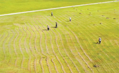 為迎接投洽會的到來近日工人正抓緊對會展中心的草坪進行梳理。廣袤的綠地,翻起一道道窄窄的埂,散落著一堆堆小小的草,恰似希望的田野,又如耕耘中的田園美景。(常海軍 攝)