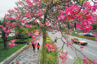 在鷺江道輪渡附近,有一棵樹卓爾不群,數百朵的粉紅鮮花盛開枝頭,讓人不禁想起席慕容寫的《一棵開花的樹》的詩句,“ 如何讓你遇見我,在我最美麗的時刻……”這種樹開花酷似紫荊花,但植物專家說它的學名叫美麗異木棉,原產南美洲的巴西、阿根廷,因其樹形優(yōu)美奇特,花朵艷麗,花大而密集,異常燦爛,還有個別名叫“美人樹”。(藍添藝 攝)