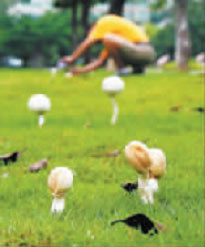 幾場大雨過后,24日,在廈門大學嘉庚樓前的草地上竟然長出了一簇簇的蘑菇,黃、白等鮮艷顏色和綠地形成反差,吸引不少路人拿起相機記錄。(藍添藝 攝)